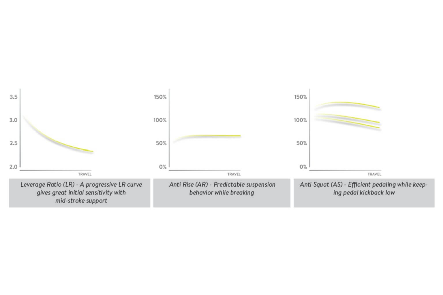 Oblikovanje vzmetenja je igra ravnovesij. Tradicionalno je potrebno sklepati kompromise med razmerjem vzvoda (Leverage Ratio), lastnostjo posedanja med poganjanjem (Anti Squat) in lastnostjo raztegovanja pri zaviranju (Anti Rise) ter kako te dejavniki vplivajo na strukturo okvirja in samo zasnovo okvirja.
