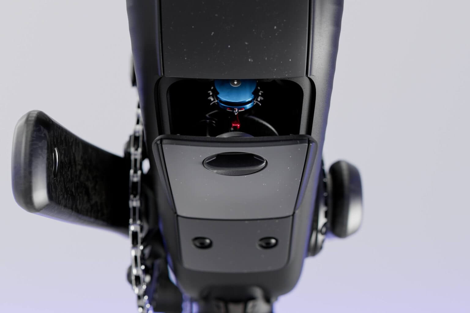 Pokrov na spodnji cevi je izjemno enostavno odstraniti s preprostim obratom gumba. Velika odprtina močno olajša nastavitve amortizerja in napeljavo kablov. Poleg tega je odstranitev amortizerja mala malica. Manjše okno na pogonski strani sedežne cevi omogoča neposreden dostop do vijaka amortizerja.